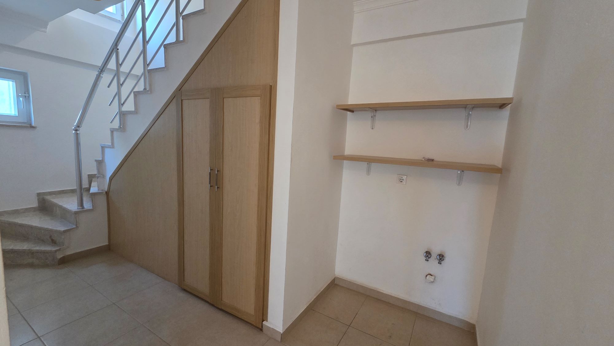 The marble staircase leads to the lower floor, dedicated to privacy and rest.