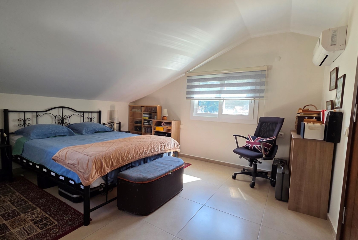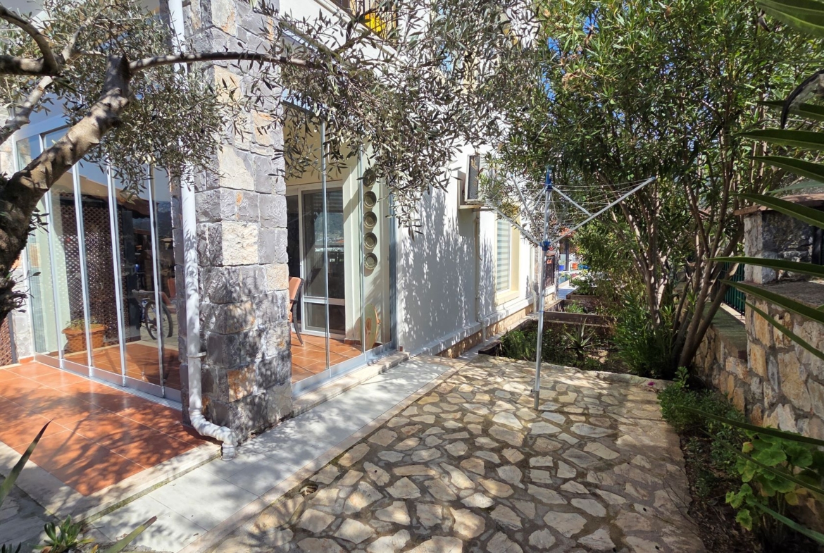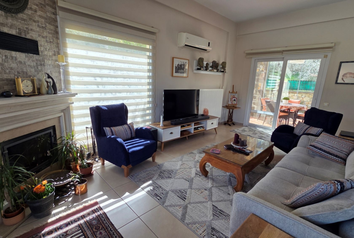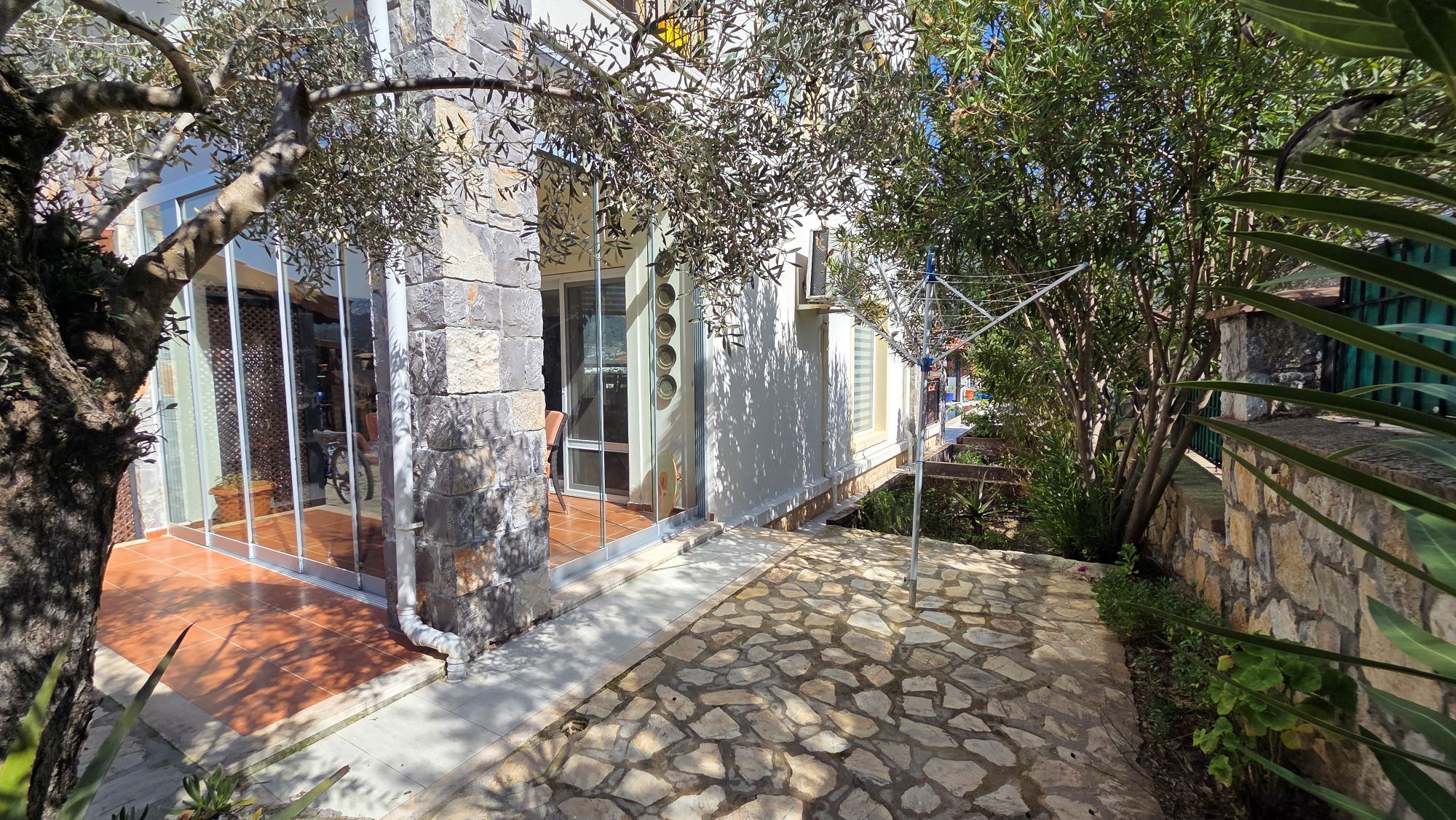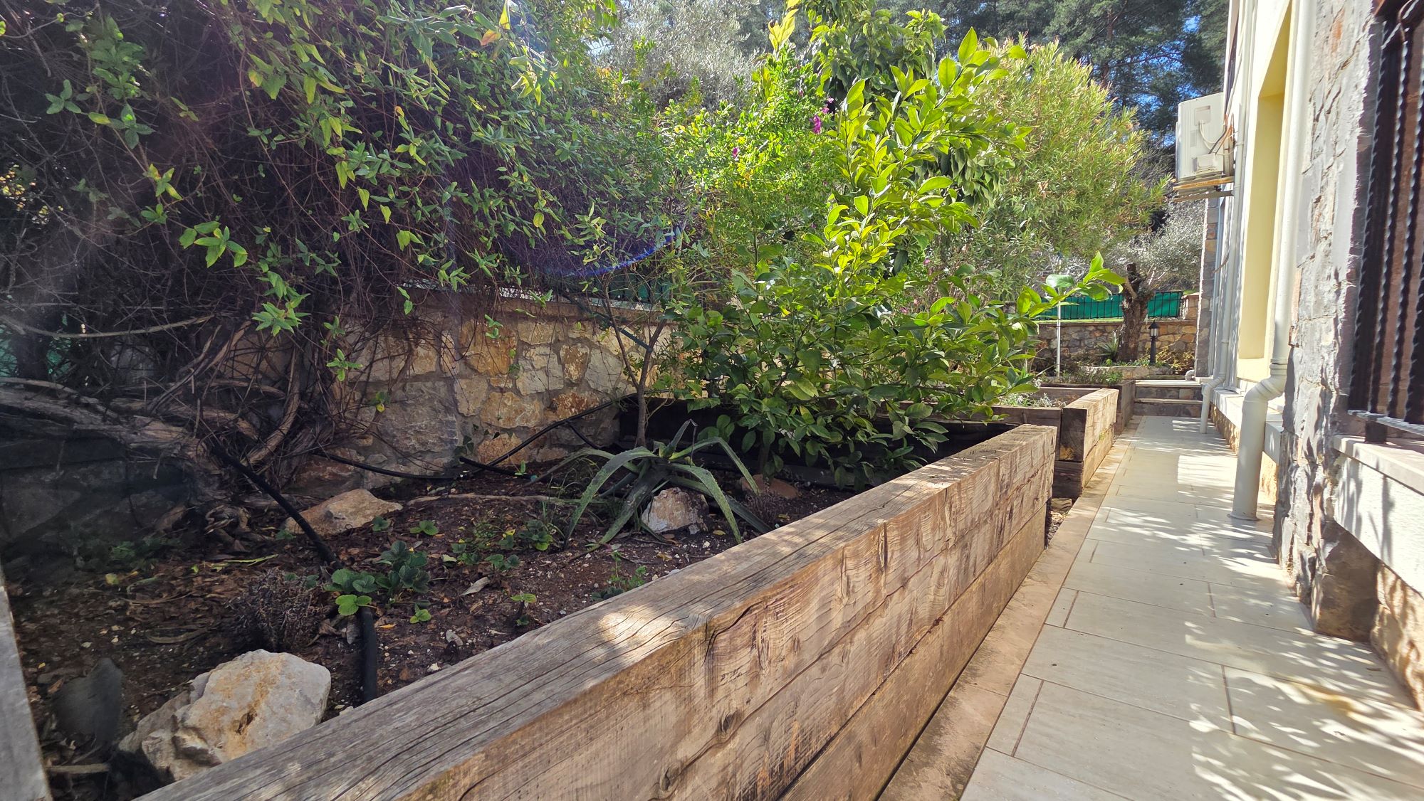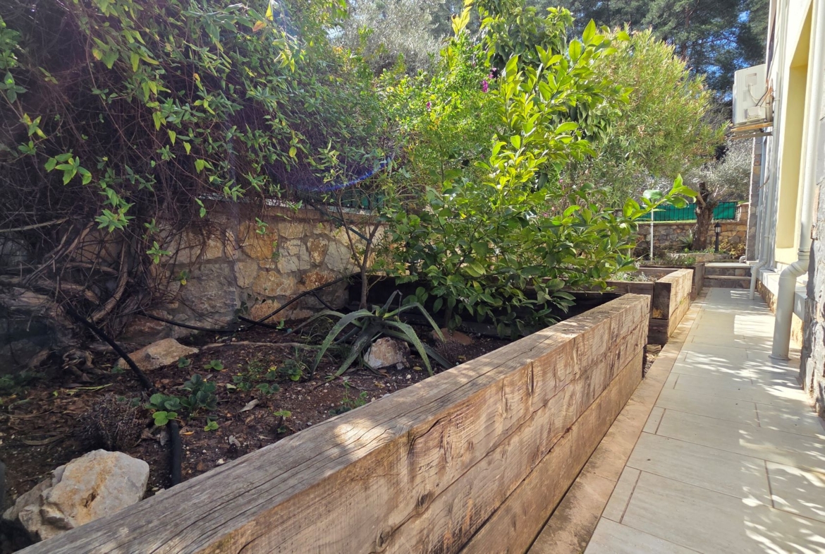 The villa is designed for Mediterranean living, featuring a well-established garden with mature olive trees and a private 45 m² swimming pool.