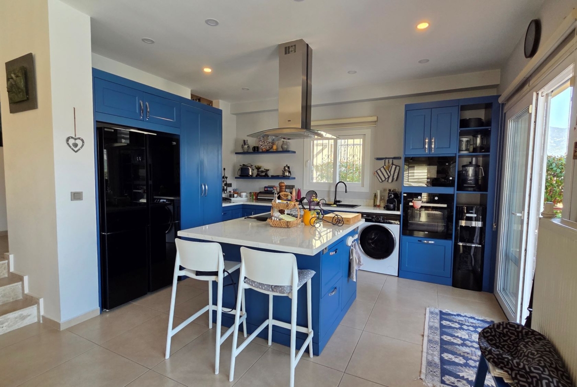 Modern Kitchen: Recently updated with striking blue cabinetry and high-end finishes, leading directly out to a very large front terrace.